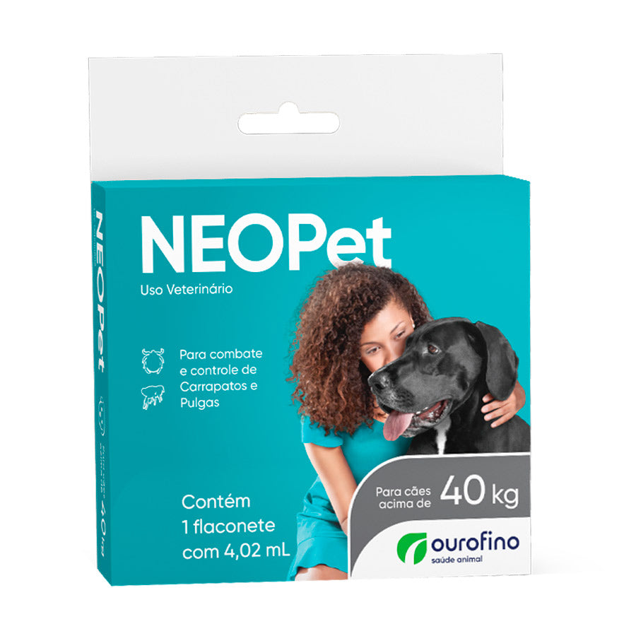 O Antipulgas e Carrapatos Ourofino Neopet 4,02 mL para Cães acima de 40 Kg atua no controle de pulgas e carrapatos. Deve ser reaplicado a cada 30 dias. Eficácia em menos de 48 horas após a aplicação. Neopet não possui ação repelente - o controle de infestação do ambiente deve ocorrer concomitantemente ao controle dos parasitas externos dos cães. As pulgas, além de causarem intenso prurido, transmitem vermes aos cães e desencadeiam a DAPP (Dermatite alérgica a picada de pulgas). Neopet mata a pulgas e carrapatos por contato, sendo altamente seguro. O Rhipicephalus sanguineus é o carrapato mais adaptado do mundo, sendo portator de parasitas que podem ocasionar doenças nos cães, bem como no homem (zoonoses). O Neopet possui 4 apresentações abrangendo cães de pequeno a porte gigante.