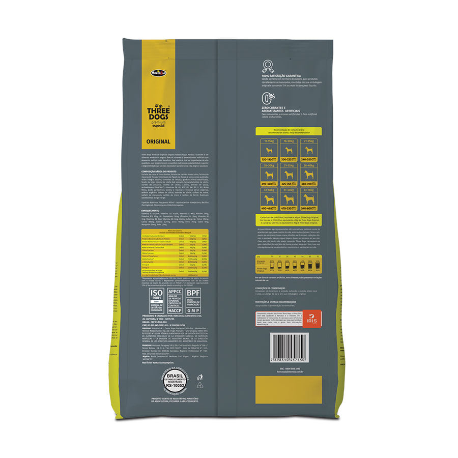 Ração Three Dogs Original para Cães Adultos de Raças Médias e Grandes Sabor Frango, Carne e Arroz